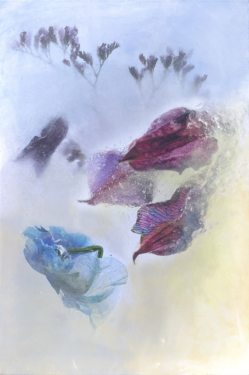 Al enige tijd ben ik bezig met mijn project ‘Frozen Flowers’, fotografie van ingevroren bloemen (Frozen Flowers) en gemengde techniek op doek. Het proces van invriezen, ontdooien, fotograferen en bewerken blijft mij fascineren en er zijn steeds nieuwe verrassingen en inzichten.