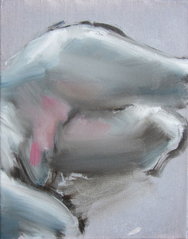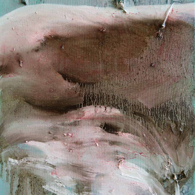 Het vloeit, stuit op korsten, omsluit ze. Het proces laat zich bijsturen maar nooit helemaal beheersen. Ik ‘knip’ mijn beelden uit kranten en tijdschriften. Soms schilder ik ze ook in levende lijve. Mensen in alledaagse situaties worden zo ontdaan van hun context. De laatste jaren licht ik er een deel uit zodat het beeld nog vreemder wordt. Als geheimtekens bijna, organische vormen die botsen of elkaar juist ondersteunen. Dichtbij maakt soms onbekend.