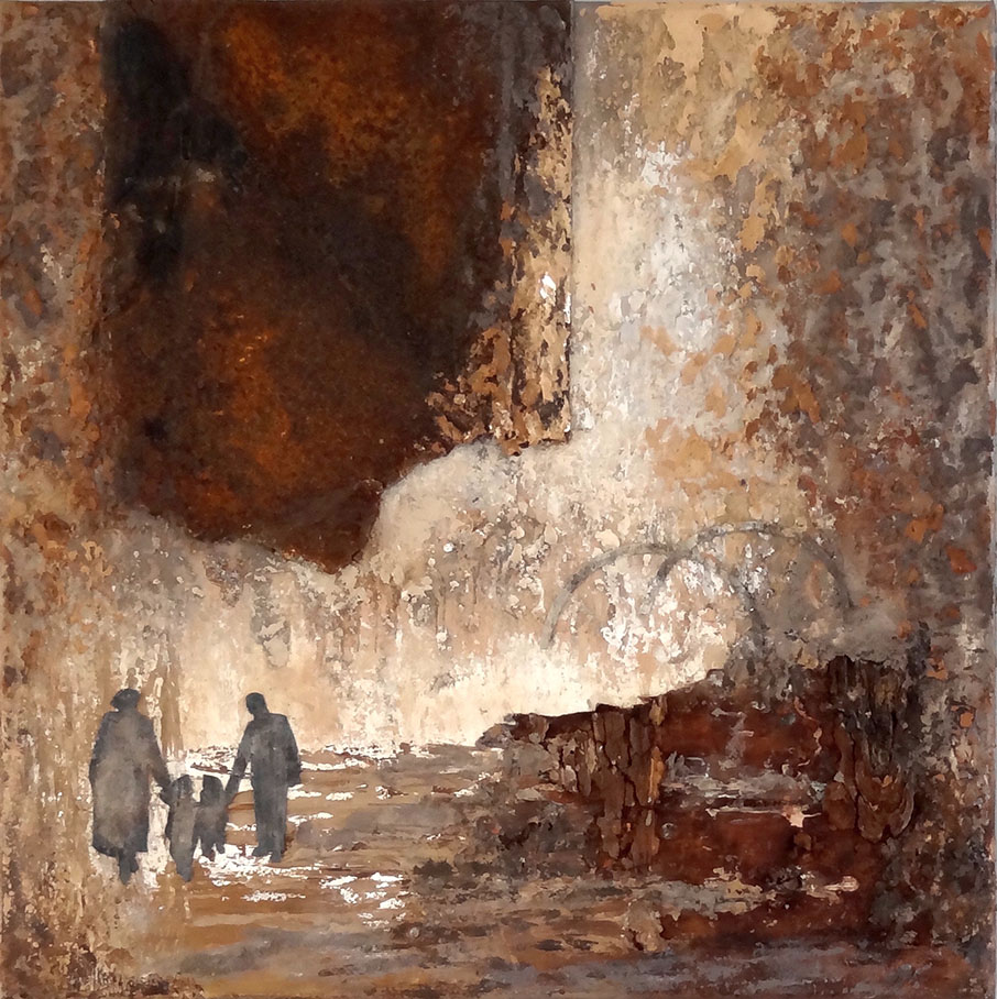 ‘Memories’ bevat een verweerd stuk roest dat ik vond aan de kant van de weg. Het voerde mij terug naar mijn kindertijd in Hengelo, waar, tegenover ons huis bij de Storkfabriek, grote roestige buizen lagen. Ik kroop er samen met mijn tweelingzusje en onze hond doorheen en speelde er verstoppertje. Het gevoel van die tijd is afgebeeld in dat stuk roest, de binnenkant van de schors van een berkenboom en dikke lagen zand. Ik heb laag over laag gewerkt en het zand met