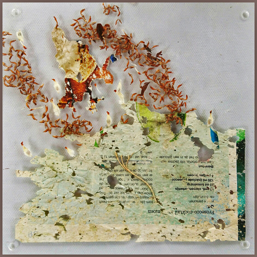 Toeval speelt tevens een rol in mijn werk en heeft mij een andere kunstvorm gebracht: werken met papier, zoals de serie ‘Dynamic Organics’. Er zijn ooit schetsen tussen de planten in mijn tuin beland. Later bleek dat dit papier aan diverse organische processen had blootgestaan. Het was prachtig ‘bewerkt’ en ten dele geconsumeerd door slakken. De fascinatie hierover bracht mij ertoe de dynamiek van dit proces in een eigen compositie uit te drukken. Door mijn tuin vol met papier te leggen en veel geduld te hebben, kwam ik aan meer materiaal. Uiteindelijk werd plexiglas gekozen als ondergrond, in een driedimensionale omlijsting. Diepte, schaduw en beweging van het papier vormen een essentieel onderdeel van het werk, dat door het (zon-) licht die extra dynamische werking heeft. Tegenwoordig vindt er een ‘kruisbestuiving’ plaats; dit proces vormt weer de aanleiding voor het schilderij ‘Traces in my Garden’.