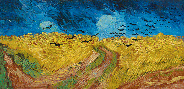Toen ik enkele weken geleden werd gevraagd door een organisatie in Assen om iets te bedenken voor Kunst Aan De Vaart met als thema het Van Gogh jaar zag ik meteen het schilderij ‘korenveld met kraaien’ voor mijn ogen. Een blauwe lucht boven een geel korenveld. Op het theater van Assen, DNK, staan nu 11 afbeeldingen achter elkaar van ieder 3,5 meter breed en twee meter hoog en op internet zwerft nu een ‘animated gif’ die ik samen met deze column stuur.