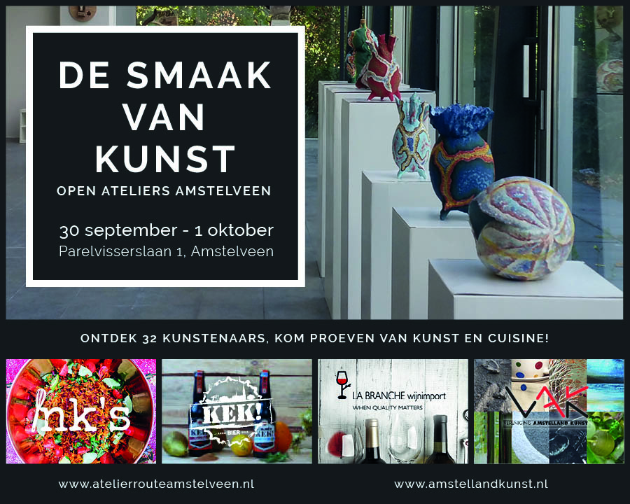 Amstelland Kunst organiseert op de locatie Parelvisserslaan 1 te Amstelveen een nieuwe formule voor Amstelveen, waarbij naast de 32 exposerende kunstenaars tevens een aantal jonge/nieuwe horeca-ondernemers een ‘proeverij’ en hun producten aanbieden.