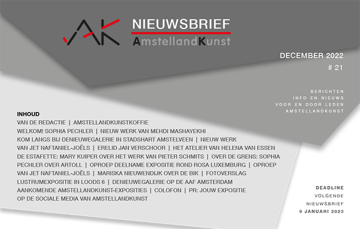 Het informele samenzijn AmstellandKunstKoffie was heel geslaagd en nodigt uit tot voortzetting van dit initiatief. We heten Sophia Pechler van harte welkom.