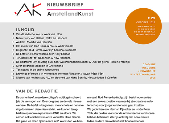 missen!! Rud Perree beëindigt zijn beeldhouwcarrière met een solo-expositie waarmee hij zijn creatieve nalatenschap voor jonge kunstenaars gaat inzetten. We gedenken ook Herman Pijnacker en István Péter Tóth, die beiden veel voor de Amstelveense kunstscene hebben betekend. We zijn ook blij met onze nieuwe leden. In deze nieuwsbrief stelt houtkunstenaar Maartje van Deursen zich voor. We heten haar van harte welkom!